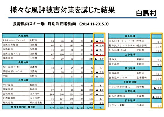 様々な風評被害対策を講じた結果、白馬村のスキー場の利用者数は八方尾根スキー場が2%減、岩岳が2.1%減、五竜・47が8.4%減でした。やはり風評被害はあり、減少しましたが、対策が実を結んでこの程度の被害で収まったと思っています。というのも隣の小谷村のスキー場は12%減でした。このスキー場もほぼ同じ状況だったにもかかわらず違いが出ました。及第点なのかなと思っています。