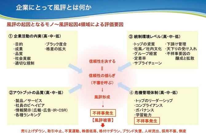 風評の起因を便宜的に分けると4領域に分類できます。「企業活動の内実」「(企業活動の)アウトプットの品質」「統制環境レベル」「危機管理体制」になります。それぞれの領域で高・中・低とレベル判定ができます。危機管理体制だけでも高レベルになっていれば、不祥事は本来発生しないはずです。ただし、自分たちは高だと勘違いしていて(甘い自己査定)、実際には中や低レベルに留まっていると不祥事が発生しやすくなるのです。この4 領域すべてが企業の信頼性を決定します。各領域でレベルが低いままでいると、徐々に風評が形成(あるいは固定)され、続いて不祥事が発生し、さらに風評被害が出ると最悪の場合は倒産に至ります。企業としては、絶えずこの4つの領域で「高」判定を目指すべきです。