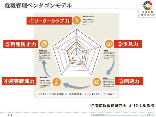 風評の動きを早期に察知できる体制を整備することが大切です。そして、それをマネジメントすることが重要です。我々が独自に開発した危機管理ペンタゴンモデルは、危機管理に重要だと考える5つの力をもとに分析します。5つの力とは「リーダーシップ力」「予見力」「回避力」「被害軽減力」「再発防止力」になります。リーダーシップ力はクライシス全般に必要な力です。予見力、回避力はクライシスが発生する前の準備段階でどのようなことができるかという力です。クライシスが発生した後が、被害軽減力と再発防止力になります。
