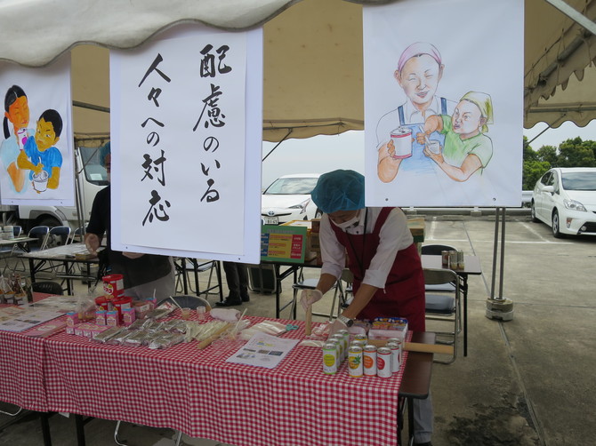 屋外テントも設置しました。ここは私の出番です。せっかくの機会なので、私は「『食』・水がない~配慮のいる乳幼児、高齢者への対応」というテーマでのワークショップを開催し、熱も水も使わないで離乳食、高齢者食を作る方法を提案しました。それは、市販の離乳食やおやつ類を備蓄しておき、いざ災害というときには水と熱を全く使わずに食品同士を組み合わせるやり方です。参加者に実際に作っていただく体験コーナーも設けました。