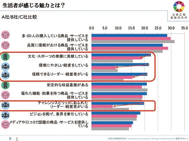 では、魅力的な会社、特にネットで魅力的な会社とは。これは食品業界のA 社、B 社、C 社を比較したデータです。差が出るのは例えばチャレンジスピリットに溢れたリーダー・経営者がいるかいないか、信頼できるリーダー・経営者がいるかいないか、環境に優しい経営をしているかに差が出ます。商品的魅力では差がつ