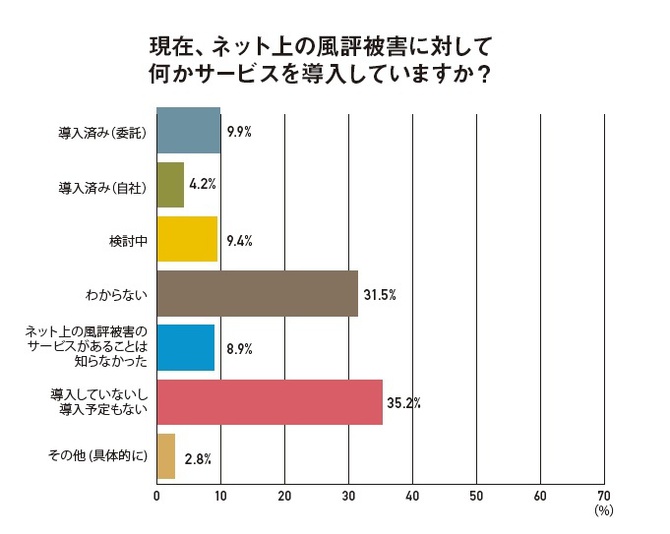 ネット上の風評被害に対して特定のサービスなどを導入しているかとの問いについては「導入していないし、導入する予定もない」が35.2%で最多。「自社で導入済み」が4.2%で、「外部の専門業者に委託して導入」が9.9%で合わせて14.1%となった。