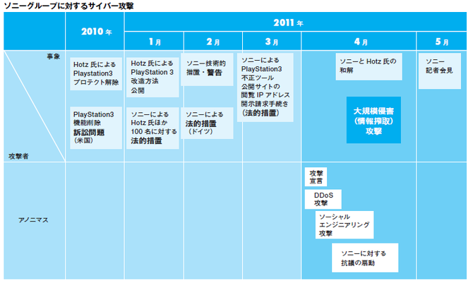 2011年4月、米国ソニーに対する大規模なサイバー攻撃が発生した。ゲーム機などのネットワークから不正アクセスが集中し、約1億人以上もの顧客情報が第三者により外部に流失。サイバー脅威の問題として国内外で大きな社会問題となった。 事件のきっかけは、2010年1月に発生した米国人ハッカーによる同社ゲーム機のプレイステーション3のハッキング事件までさかのぼる。長期に渡り世界各国のハッカーを相手に法的措置を繰り返していたことが、ソニーに対峙する不正ユーザーやハッカーの急増を招いた。