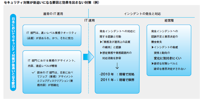 日本企業の多くは、サイバー攻撃対処活動を業務運用上の品質の問題として認識し、もっぱら現場のエンジニアに対応させることが多い。サイバー攻撃に対する経営層の認識は乏しく、意思決定の機会が喪失しているため、現場対応が限界になった時、意思決定に時間を要してしまう。一方、欧米では、日常の運用・保守の現場担当者は、サイバー攻撃が発生した場合、定められた業務の範囲内で対応し、対応が難しい場合や範囲外の対応業務が発生した場合は、すぐに中間管理職を通じて、経営層に伝達される仕組みになっているところが多い。それを受けたCISO/CSOの判断の下、外部から専門家を派遣するなど、経営的対応を施すことで迅速にサイバー攻撃に対処できるのだという。
