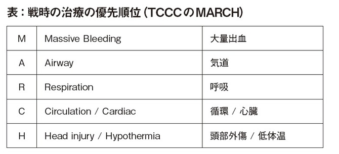 われわれ救急医が通常、病院で行う救急医療では、常にABC(Airway, Breathing, Circulation)を意識して、①気道 → ② 呼吸 → ③ 循環と優先順位をつけて治療を行うようにしています(本誌2015 年3 月号p.95 ABCDE(F)アプローチ参照)が、軍隊や戦時の医学を専門とする戦傷学の専門家によれば、まず大量出血を優先させて対処することが重要だそうです。