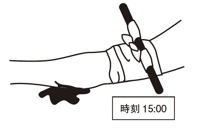 まずは慌てずに圧迫して止血です。血液に触れないように手袋(ゴムやビニール製)をしますが、なければビニール袋なども代用できます。きれいなガーゼやハンカチなどを用いて出血している場所の真上をピンポイントで強く押さえます。これを直接圧迫止血法といいます(本誌2015 年7 月号p.108「 キズの応急処置」参照)。血が止まったかどうか?気になって圧迫を緩めてキズ口を観察するとなかなか血は止まりませんので、応援が来るまでは押さえたままでじっと我慢です。