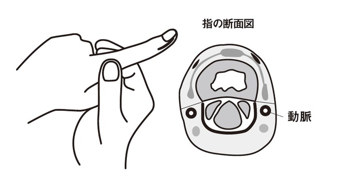キズよりも心臓に近い太い動脈を圧迫して血液の流れを減らすことで止血効果を期待するという方法です。例として左示指先端のキズから出血している場合の間接圧迫止血法を示します。これは指の動脈が両側面を走行しているので指を両側からつまむように圧迫することで止血しています。もちろん直接圧迫止血を行いながらこの方法を付け加えると認識してください。