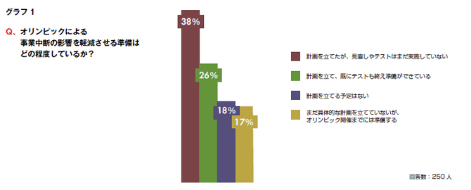 それによると、オリンピックによ る事業中断の影響を軽減させる準備はどの程度しているか?との問いに 対して、26%の企業が「計画を立て、既にテストも終え準備ができて いる」と回答。38%の企業が「計 画を立てたが、見直しやテストまで は実施していない」とした。また、17%の企業が「まだ具体的な計画 を立てていないが、オリンピック開 催までには準備する」と回答。 「計画を立てる予定はない」との回答は 18%にとどまり、8割以上の企業が、対策の必要性を認識しているこ とが明らかになった(グラフ1) 。