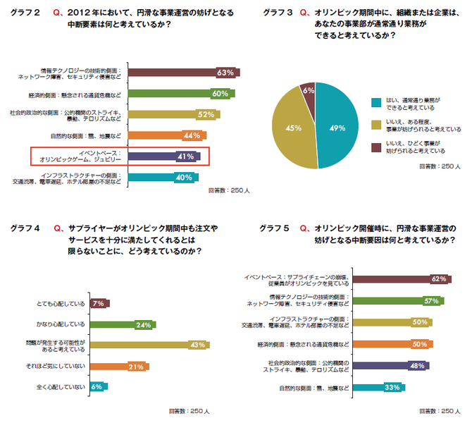 オリンピック期間中に、組織また は企業は、あなたの事業部が通常通 り業務ができると考えているか?と の問いには、45%の担当者が「いいえ、ある程度、事業が妨げられる と考えている」と回答(グラフ3) 。