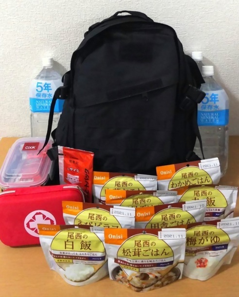 リュックサックには、保存水、非常用アルファ米、発熱セット、救急セット、非常用トイレなどが入っている。発熱セットには、少量の水さえあれば火や電子レンジを使わずに加熱できる「バロクック レクタンギュラー」を備え、災害時でも温かいご飯を食べることができる。非常用アルファ米は、水だけで食べることも可能だ。