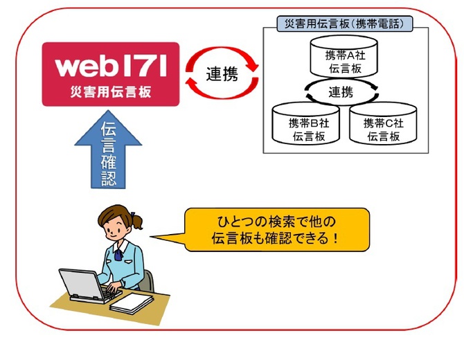 「災害用伝言板(web171)」は、震度6弱以上の地震など大きな災害が発生した時に、被災地域に住む人や滞在中の人が、携帯電話やスマートフォンから自身の状況を登録することができ、登録された安否情報はインターネットなどを通じて全世界から確認できる災害時専用のサービスだ。