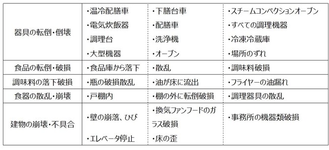 地震の場合、調理場の混乱は調理を困難にしますが、損壊の状況はどうだったのでしょうか(表)。