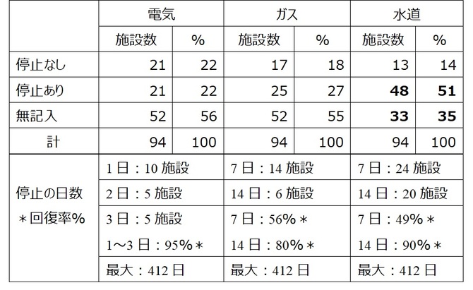 熊本地震の場合、強い地震(1回目M6.5、2回目M7.3)であったため、福祉雛所におけるライフライン停止は、電気、ガス、水道ののうち水道が最も高く51%、停止期間は7日と14日が半々でした。井戸水を頼りにしていましたが、水が濁り使用困難で不自由しました。