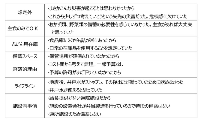 発災直後1日目の1食分の食事はどうでしょうか? その内容は、ご飯と1品のおかず、もしくはおかずなしで粗末なものでした。主食だけ備蓄し、おかずが要ることに気が付かなかったというのんきな答えもありました。災害が来るとは思っていなかったのではないでしょうか。問題は施設に十分な備蓄がなかったためでしょう。