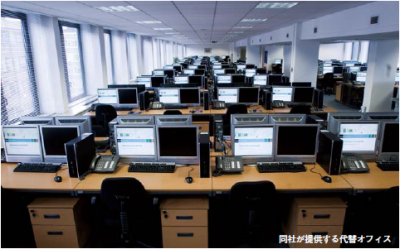 数多くの代替オフィスやバックアッ プセンターを持ち、それぞれ無停電電 源装置、 自家発電装置、 予備燃料といっ た基本的対策はもちろん、専用の通信 回線や 14 ものインターネット・サー ビス・プロバイダーとの接続環境を整 えているなど、 ハードへの自信は高い。