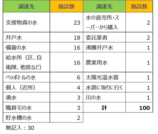 水の入手は施設の「関連先から」が目立っていました。自衛隊、区の給水車、救援物資、委託業者、上水道局などです。さらに、自然水、地元の応援のほか、個人的な知人・友人も加わります。さらに販売所へ買いに行く、他県の応援もあります。積極的に多方面から水の支援を求めた様子がうかがえます。