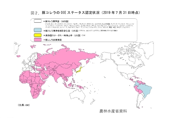 日本は、これまで豚コレラ清浄国であると認定されてきました。すなわち、豚コレラ汚染国からの、豚、豚肉の輸入をこれまで許可してきませんでした。農林水産省は、現在発生している豚コレラは限定的なものであり、しかも野生動物であるイノシシからたまたまウイルスの感染を受けた養豚場だけに発生しており、養豚場から養豚場へのウイルス伝播は起きておらず、従って、国全体が豚コレラ汚染国にはなっていないという立場を示してきたと筆者は解釈しています。OIEも、日本を豚コレラ汚染国とせず、豚コレラ汚染の疑いのある国にとどめてきました(図2)。