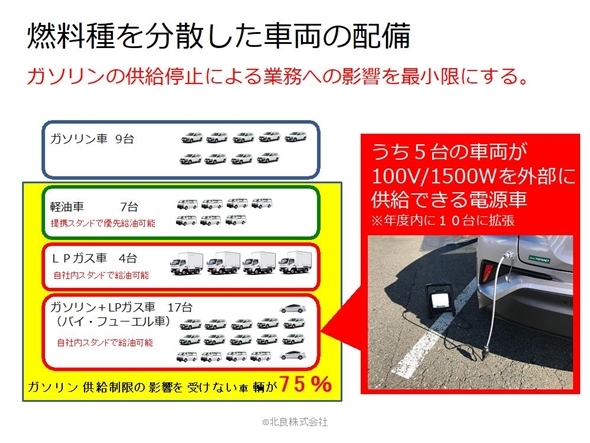 過去の災害の分析は重要ですが、災害ごとに想定外も起こります。そんな時に何が使え、何が使えなくなるかは、災害ごとに異なるといっても過言ではありません。だから、多様性の確保が重要になります。同社は、ガソリンの供給制限の影響を受けない車両を75%にまで高めます。