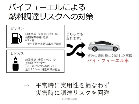 そして、ガソリンでも動き、LPガスでも動くバイフューエル車であれば、平常時に実用性を損なわず、災害時に調達リスクを回避できるため17台導入しました。