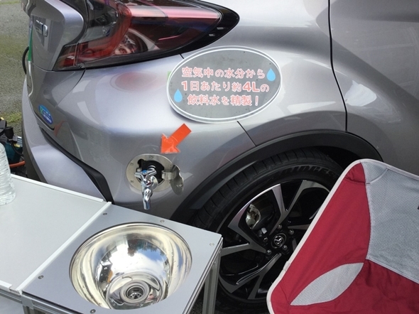クルマに蛇口がついてるー! これ、私の防災講座でも紹介させていただいているのですが、こどもたちにもウケがよくて! クルマに蛇口ですよ。斬新すぎる。しかも、空気中の水分から1日4リットルも水を精製できるのです。クルマってこんなことまでできてしまうのですね。
