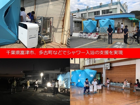 台風15号の被災地支援では千葉県の断水、停電した地域において、WOTA株式会社と共同でこうした発電、水のリサイクルシステムを組み合わせ、シャワー入浴支援も実施されています。