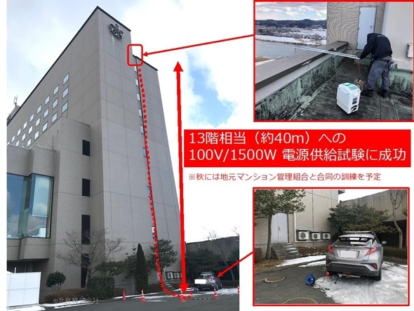 さて北良株式会社は、他にもこのバイフューエル&ハイブリッド車を使って、100V(ボルト)/1500Wを使った13階までの電源供給にも成功しています。高層階から動かすことのできない在宅患者さんを動かさず、在宅のままで電力供給する支援方法として画期的です。