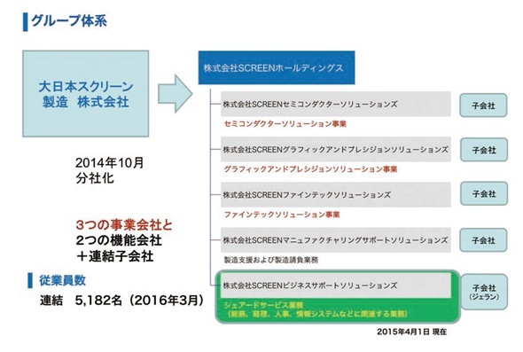 SCREENグループは、2014年10月に大日本スクリーン製造株式会社(京都市)が持ち株会社体制に移行したことに伴い、SCREENホールディングスと3事業会社・2機能会社、子会社で構成する。連結子会社は国内26社に対し海外は24社で、現在、連携での従業員数は約5000人。売上ベースでは約7割が欧米・アジアが占める。