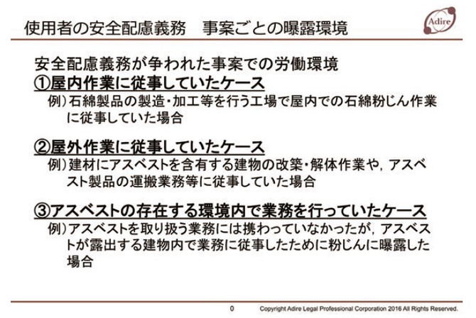 安全配慮義務違反が問われるのは3つのケースに分けられます。石綿製品の製造・加工等を行う工場の屋内で作業させていたケースと屋外で作業していたケース、そしてアスベストの存在する環境内で業務を行っていたケース。これは直接アスベストに関する業務はしてないが、その近くで作業したことで被害を受けたものです。