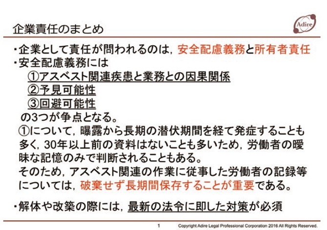 そして実際に問われるポイントは3つあります。このうち1つでも責任がないと示せれば責任が問われることはありません。1つはアスベスト関連疾患の発症と業務との因果関係の有無。簡単に言えば、やらせていた業務が原因となって中皮腫などの疾患が発症したと判断できるか。つまり、アスベストに曝露する可能性がある業務であったかどうか。