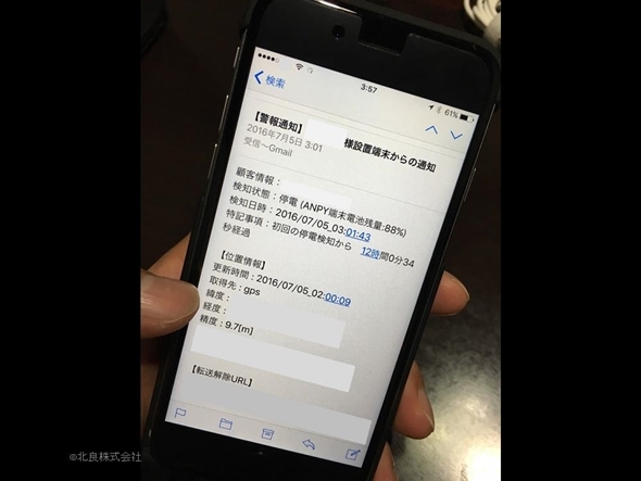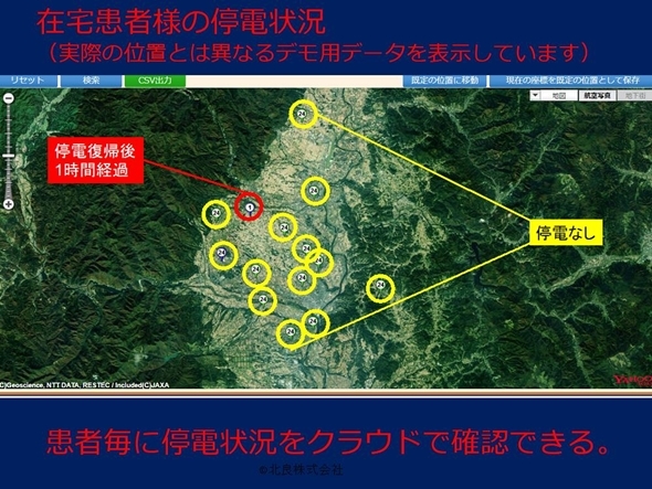 上はANPYからの通知メールです。停電が起こるとまずスマートフォン上にも通知がきます。通知には位置情報のリンクがあり、そこまでの道のりをナビで確認することができます。また、管理者はクラウドのシステムにログインすると