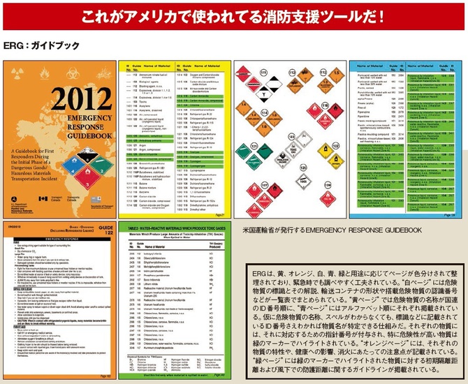 こうしたシステムも併用することで、もし爆発事故や流出事故などが起きた場合に、どういった危険物質がどの範囲に及ぶのかを、事前に確認することができる。日本でも、2013年から総務省消防庁が「消防・救助技術の高度化等検討会」を設置し、ERG日本語版の発行が整いつつある。