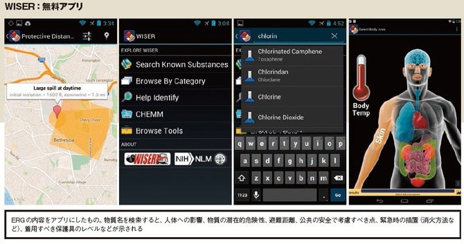 一方、米国では、緊急時応急措置指針(Emergency Response Guidebook、ERG)や「WISER」と呼ばれるシステムがある。WISERとは、米国立衛生研究所(National Institutes of Health、NIH)の一部門である国立医学図書館(National Library of Medicine)が開発した、スマートフォンでも利用できるアプリケーションの名称だ。危険物事故における危機対応を支援するために設計されたもので、危険物質の識別のサポート、危険範囲、物理的特性、人間の健康情報、封じ込めおよび抑制アドバイスなどを提供しており、CBRNE災害の現場でも既に活用されている。