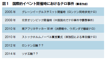 図1に示したように過去の事例からも、さらにオ リンピックの歴史では 72 年ミュンヘン、96 年アトランタでもテロ事件が発生していることより、世界 の注目が集まるイベント時にテロリストがそれを格 好の機会として認識しない事はあまり考えづらい。 ロンドン五輪開催時、その直前には重要権益施設、 公共機関などでは警戒レベルが引き上げられ、厳重 な警備が実施されると思われるが、ロンドンだけで はなく欧米諸国の大都市でも同程度のテロ対策が実 施される可能性もある。結果論、ロンドン五輪で未 遂を含めたテロ事件が発生しない事を祈ってやまな いが、このようなリスクについて東日本大震災を経 験した日本人は、危機管理的観点から学ばなければ いけないと筆者は考える。