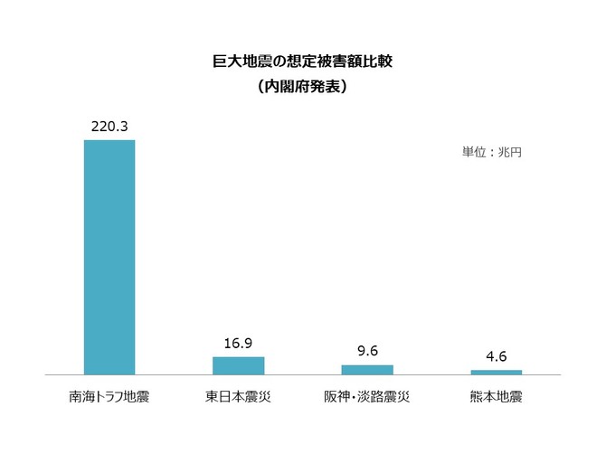 今後30年間での発生確率80%――よく知られる南海トラフ地震の発生確率であるが、実際に起こる損害をイメージすることは難しい。地震発生時には、東海、近畿、四国、そして九州2県で約9割の停電と一帯のライフライン遮断が予想されるため、サプライチェーンへの影響は必至であり、一企業だけでは対策に限界があることは 明らかである。政府は、この被害想定をもとに地方自治体、そして民間に「自助」による対策を促すものの、地方自治体も政府からの公助(事後の補償)を期待し、自助を進めるインセンティブが働きにくいという日本の構造的な問題が浮き彫りになっている。実際、東日本震災の災害復旧事業は、80%以上が国庫負担、残りは震災復興特別交付税からねん出され、地方自治体負担分はなかったと言われている。南海トラフ地震による被害額は220兆円と想定されており、この金額は東日本震災23兆円の約10倍、年間国家予算の2倍ともなる。このような莫大な被害となれば、国庫取り崩しと増税による公助では賄いきれないことは明白だ。政府主導で官民一体のリスクコントロール(軽減策)とリスクファイナンス(財政的な転嫁策)の具体化が求められる。