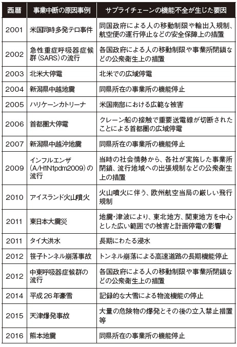 日本でのBCPに関する議論は、主に地震に集中しているが、日本企業の事業中断の原因は地震のような自然災害に限らない。2001年以降の主な事業中断の事例を示す(表1)。