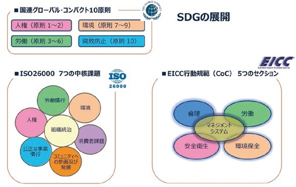 ISOの認証を取得している会社はたくさんありますが、実はコンプライアンスを100%守っているのか証明する方法はありません。コンプライアンスを証明しようとすると、すべての活動をチェックする必要があります。しかし、すべての場所ですべての活動をすべての時間軸でチェックするのは不可能です。そこで、さまざまな原理原則ができました。有名な3つを提示します。1つは国連グローバル・コンパクト。Sustainable Development Goalsをつくり、人権、環境、労働、腐敗防止の4つについて国際的な基準を設けています。次にISO26000。これはCSRのガイドラインです。7つの中核課題のうち組織統治を中心に置き、その周りに環境、消費者課題、コミュニティ、公正な事業慣行、人権、労働慣行があります。ISO26000と国連グローバル・コンパクトは密に連携しているので矛盾が生じないように構成されています。それからEICC。電子・電気業界の行動規範です。マネジメントシステムが中心にあって、労働、安全衛生、環境保全、倫理が並びます。この3つの基準に共通しているのは、中心にマネジメントがあることです。その周囲には環境と労働安全が置かれます。つまり、これらが企業の存立条件だと示しています。