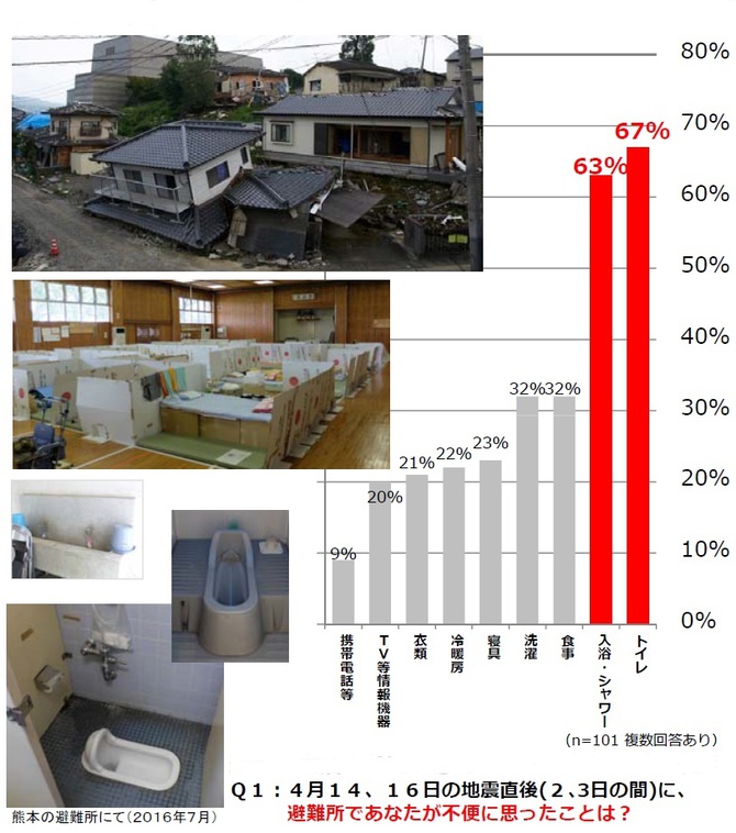 避難所のトイレのほとんどが和式主体で、洋式便器は長蛇の列だったため、長期避難者の大半を占める高齢者から「和式便器が使えない、不便」という声があがった。入浴・シャワーができないことから温水洗浄便座を求める意見も多くあった。学校など避難場になり得る施設では、トイレの洋式化が急務であることがあらためて確認された。