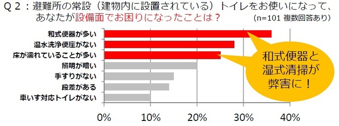 「避難所の常設トイレの設備面で困ったことは?」の設問では、第1位が「和式便器が多い」(36%)、第2位が「温水洗浄便座がない」(28%)となった。第3位は「床が濡れていることが多い」(25%)で、以下「照明が暗い」(20%)、「手すりがない」(15%)、「段差がある」(14%)、「車いす対応トイレがない」(10%)と続いている。