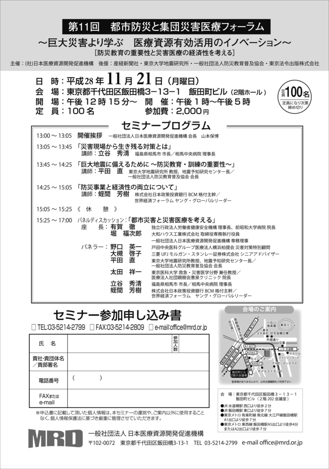 防災教育の重要性と災害医療の経済性を考える「第11回都市防災と集団災害医療フォーラム」が11月21日、東京都千代田区の飯田橋ビルで開催される。テーマは「巨大災害より学ぶ医療資源有効活用のイノベーション」。主催は一般社団法人日本医療資源開発促進機構。