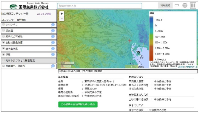日本アジアグループ株式会社(本社:東京都千代田区)傘下の国際航業株式会社(本社:東京都千代田区)は24日、災害リスク情報などをインターネット経由で提供するサービスについて、試験的に開始することを発表した。
