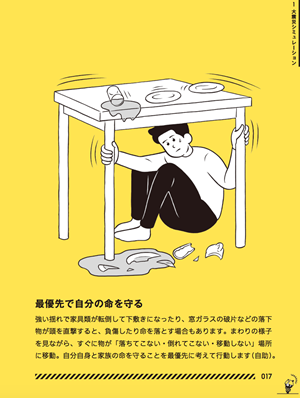 東京防災ではこのように書かれています。「まわりの様子をみながら、すぐに物が『落ちてこない・倒れてこない・移動しない』場所に移動。これ、できましたか?