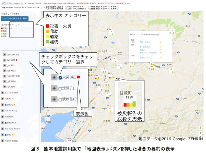 図8は、「地図表示」ボタンを押した際の要約の例を示している。地図表示ボタンを押すと、これまで操作していた画面では、カテゴリー毎の要約が表示され、さらに、新たにタブが開かれて、そこに地図を表示する画面が表示される。新規タブはポップアップとして扱われることが多く、またポップアップが制限されていることも多いので、地図表示を実行するためにポップアップを許可すること。この例の対象ツイートは、これまでと同様、熊本地震の本震から12時間分、つまり、4月16日1:30から13:30までに発信されたもの。画面左側には、被災報告のカテゴリー(「災害」、「トラブル」、「怪我」、「救助」等)がリストアップされている。各々のカテゴリーには、チェックボックス(白い四角)が左横に付いているが、それをクリックすると、該当するツイートに関係しているエリア毎に、地図上にツイート件数の大小を表すグラフと、ツイートの件数そのものが表示される。チェックボックスをもう一度クリックすると、地図上の表示は消える。グラフは、カテゴリー毎に色分けされて表示される。どのカテゴリーにどの色が割りられるかはチェックボックスをクリックした順序で決まる。例えば、図8では、画面左上に表示されているように、「災害:火災」に赤色、「救助」にオレンジ、「道路(の被害)」に黄色、「建物(の被害)」に緑色が割り当てられており、例えば、南阿蘇村周辺では救助要請(オレンジ)が出ているものの、道路の被害(黄色)や建物、インフラの被害(緑色)も出ているため、救援活動を行うには通行可能な道路を確認するなど、入念な準備が必要なことがわかる。また、広い範囲で建物の被害が報告されているが、火災の報告は一部地域に集中していることも分かる。また、図8は、地図中のグラフの一つをクリックした直後の画像であり、吹き出しで、グラフでカウントされているカテゴリーが表示されている。それらのカテゴリーをクリックすると、被災報告の抽出元のツイートが表示される。