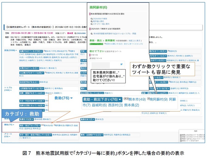 図7は、最初に熊本県を指定して、熊本地震本震発生直後12時間を時間帯として設定し、「カテゴリー毎に要約」した場合の要約の表示だ。「エリア毎に要約」ボタンを押した場合には、画面左側には自治体の名前が並んだが、「カテゴリー毎に要約」した場合には、被災報告のカテゴリー(「災害」「トラブル」「怪我」「救助」等)が並ぶ。例えば、「救助」の項を見ると、「救助・救出ください」という項目が表示されていて、その横にそのタイプの被災報告が発信されているエリアが「熊本市(49)」「南阿蘇村(9)」「阿蘇市(7)」「益城町(6)」のように、該当する被災報告の数が多い順にリストアップされる。