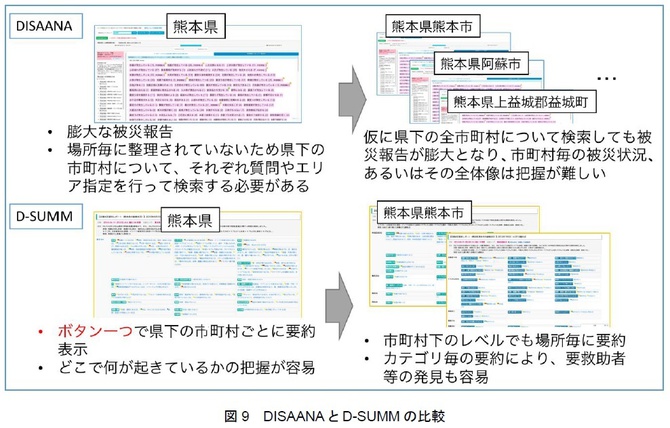 図9は、NICTが2015年に試験公開を開始した対災害SNS情報分析システムDISAANAと、今回試験公開するD-SUMMの違いを説明している。熊本地震のような規模の災害になると、DISAANAのエリア検索モードでは、膨大な被災報告が出力される。しかも、それらの被災報告は、場所毎に整理されていないため、例えば、各市区町村等を一つずつ指定して調べる必要があった。D-SUMMでは、このような煩わしさを解消し、ボタン一つで、県下の市区町村毎に要約を作成することができる。これにより、どこで何が起きているかを把握することが短時間で可能になる。また、カテゴリー毎に要約することで、要救助者等の発見も非常に容易に行える。