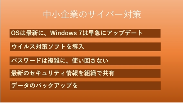 セキュリティ上の不具合がある状態でインターネットに接続していると、パソコンがサイバー攻撃の被害を受ける可能性がありますので、常に最新のOSへアップデートしておく必要があります。とりわけWindows7を使っている場合はサポートが2020年1月に終了しますので、早期にWindows10へバージョンアップする必要があります。またウイルス対策ソフトを導入するほか、パスワードは複雑に、かつ複数のサービスで使い回さないことが大切ですし、最新のセキュリティ情報を入手して、会社内で共有することも有効です。ウイルスに感染して、データが使えなくなるランサムウェアなどへの対策として、定期的にバックアップを取っておくことも必要です。