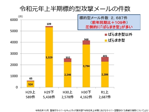A:全国の統計になりますが、下記の統計のように標的型メール攻撃が増加しています。2017年(平成29年)上期は589件でしたが、同年下期は5438件と約10倍に増加しています。その中で同じ文面のメールを1度に10件以上送るいわゆる「ばらまき型」が、今年の上期の85%を占めています。さらに全体の約9割は送信元のアドレスが偽装されており、有名企業の名前を一文字だけ変える手口が多く使われています。