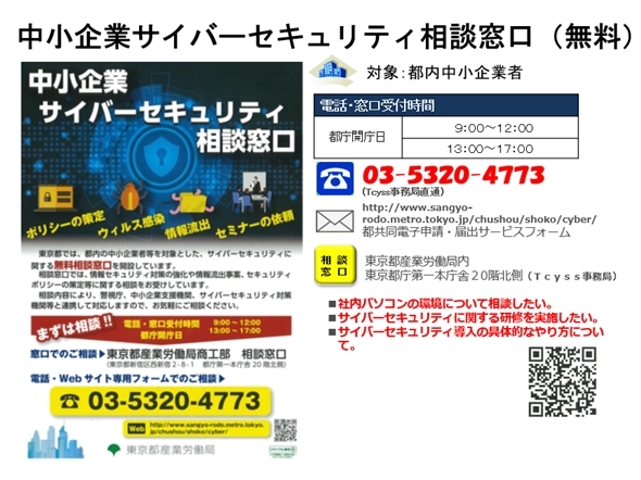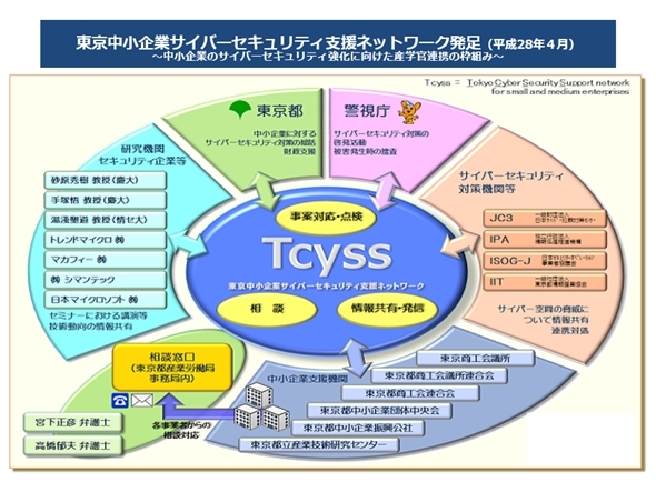 A:東京都や中小企業支援機関などとともに、東京中小企業サイバーセキュリティ支援ネットワーク(Tcyss、通称ティーサイス)を2016年に発足しました。セミナーや情報発信のほか、都産業労働局内に都内の中小企業者向けの無料相談窓口(03-5320-4773)も設けておりますので、積極的に利用してください。