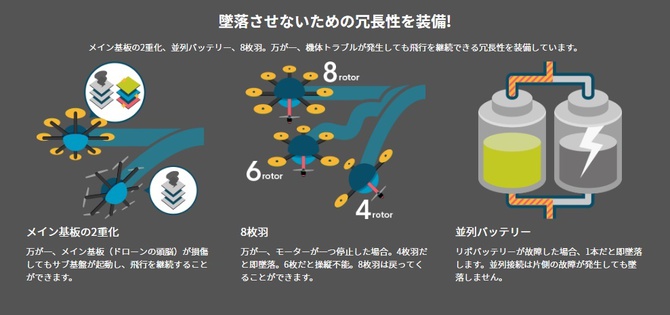 またバッテリーが故障した場合、バッテリーが1本だと即墜落するが、並列バッテリーにしているため片側の故障が発生しても墜落しない。ほかにもモーターが1つ停止した場合、4枚羽だと即墜落、6枚だと操縦不能だが、8枚羽にしているため戻ってくることができるという。