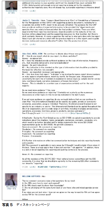 例えば、ISO31000のグループの中では、参加者の1人が「なぜ、規格の中にリスク報告書についてのガイドラインがないのか」という質問をディスカッションに投げかけると、グループに参加する危機管理コンサルタントやISO31000の策定に関わるメンバーなどから、28回ものコメントが寄せられる。そのほとんどが、10∼30行ほどにわたる長文だ。娯楽性を加味したフェイスブック上では、場違いとなり避けがちな「本気の議論」が実施されている(写真5)。
