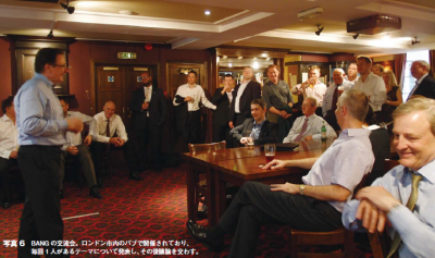 議題を投げかけたり、コメントする勇気や知識がなくても、ディスカッションの中で興味深い意見を述べている人に対して、フェイスブックのように「いいね!」をクリックすることもできる。こうした交流により、少しでも自分の存在をアピールすることで、多くの専門家と知人になれる可能性が高くなる。 また、イギリスで事業継続や危機管理に関心がある人達でつくる「BANG」というグループでは、ディスカッションに加え、月1回程度の交流会を開いている(写真6)。